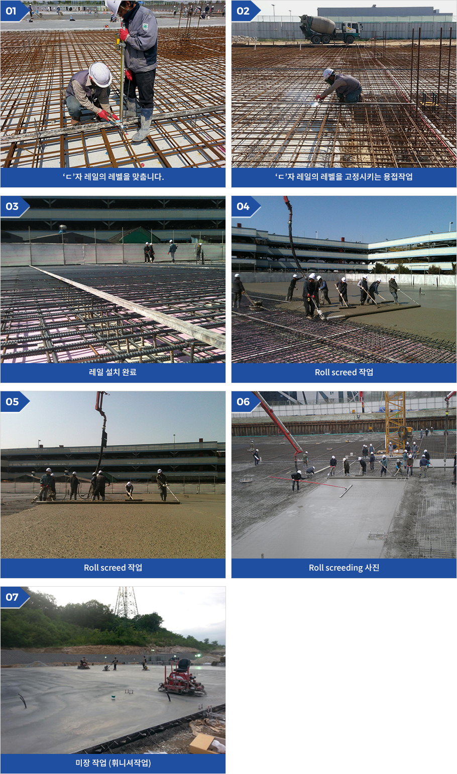 ‘ㄷ’자 레일을 기준레벨(FL)에 맞춰 일정간격(주로 6m이내)으로 설치 후 롤스크리드(Rollscreed)를 이용하여 레일위에 올려 끌어서 바닥 레벨을
