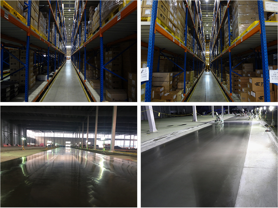 High-Rack구간에서의 바닥 평활도는 자재를 취급하는 장비 특히, 삼방향지게차량 운행에 가장 중요한 요소라 할 수 있습니다. 초평탄바닥은 높은