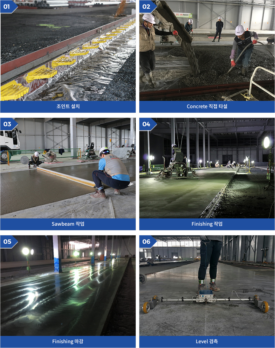 SUPER FLAT은 High-Rack을 설치하여 삼방향지게차를 사용하는 초평탄 바닥공사 레벨 중 가장 높은 등급입니다. 고도의 정밀성이 요구되는 공법으로, 풍부한 시공 경험과 물류창고 설비(하이랙, 지게차등)를 이해할 수 있는 능력을 갖춘 회사만이 가능한 등급입니다.